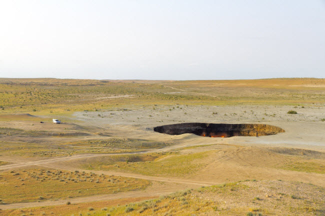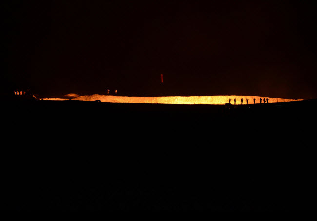 Vào ban đêm, lửa từ hố Darvaza có thể được nhìn thấy từ cách nhiều km.
