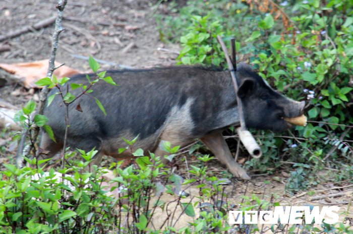 Khi còn nhỏ, lợn được đồng bào thả rông hoàn toàn, với cái cũi trên cổ.