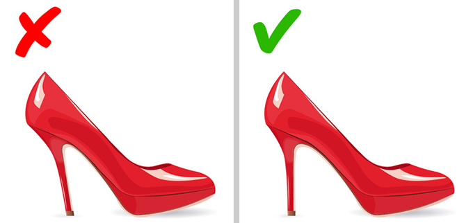 Một cách khác để chọn giày thoải mái là chú ý đến khoảng cách giữa gót và phần đế trước. Gót giày càng cao thì khoảng cách này sẽ càng ngắn. Khoảng cách 6 cm được coi là an toàn - nó giúp bàn chân có tư thế dễ chịu với độ ổn định tốt.