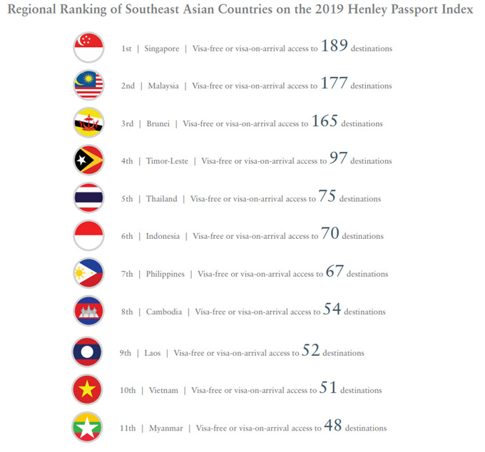 Ngoài vị trí đầu tiên của Singapore, trong bảng xếp hạng khu vực, những cái tên xếp sau là Malaysia với 177 quốc gia, Brunei với 165 quốc gia. Đặc biệt, quốc gia non trẻ Timor Leste (Đông Timor) cũng được miễn thị thực khi tới 97 quốc gia, xếp thứ 3.