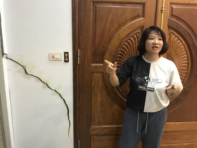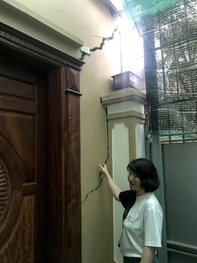 Sống trong căn nhà bị rạn từ tầng 1 đến tầng 4, ông Bưởi ngao ngán: "Cuộc sống của chúng tôi bị ảnh hưởng nghiêm trọng. Mùi hôi nhà vệ sinh thoát ra ảnh hưởng đến những người xung quanh. Nếu nó sụt xuống nữa thì tính mạng con người sẽ bị ảnh hưởng".