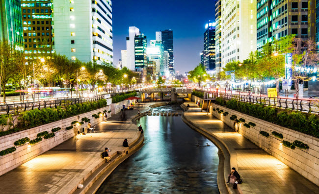 Seoul, Hàn Quốc: Ban đêm ở thành phố Seoul gần sáng như thời gian ban ngày, với các cửa hàng mua sắm, quán cà phê mở cửa 24/24. Du khách có thể đi dạo vào buổi tối tại dòng suối nhân tạo Cheonggyecheon.