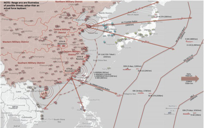 Phạm vi của các loại tên lửa đạn đạo, tên lửa hành trình, hệ thống phòng không và tàu chiến của Trung Quốc. Ảnh: Trung tâm Đánh giá Chiến lược và Ngân sách