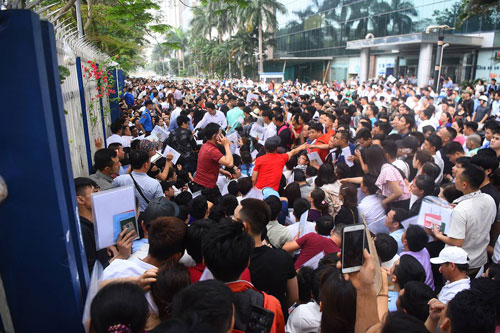 Hàng nghìn người xếp hàng trước cổng phòng Lãnh sự của Đại sứ quán Hàn Quốc ở Hà Nội để xin visa. Ảnh: Giang Huy.