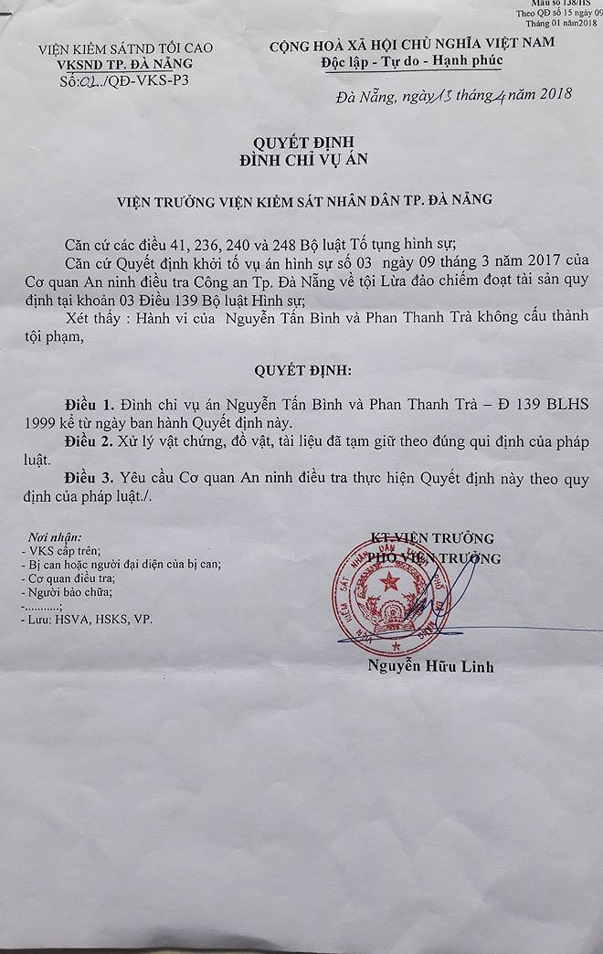 Đến ngày 13/4 vừa qua, Viện KSND thành phố Đà Nẵng đã có quyết đình chỉ vụ án Nguyễn Tấn Bình và Phan Thanh Trà do xét thấy hành vi của cả 2 không cấu thành tội phạm.