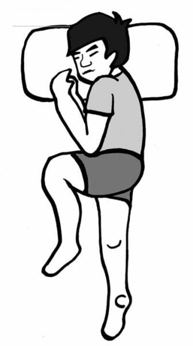 Tư thế nằm này miêu tả phần trên cơ thể nằm nghiêng trái, hơi cong nhẹ, hai tay thu về như ôm lấy lồng ngực, chân dưới bên phải cong nhẹ phía dưới, chân trái co lại nhẹ nhàng bên trên, đầu gối nghỉ ngơi chạm vào mặt giường.