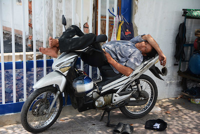 Anh Phước Long (ngụ Q.Thủ Đức), một tài xế xe ôm trên đường Phạm Văn Đồng, chia sẻ: “Nhà tôi ở ngoài Thủ Đức lận, nhưng chỗ quen hay đứng thì ở trong này. Giờ chạy về còn mệt hơn nữa, thôi nằm luôn trên xe mà ngủ trưa chút. Ngoài đường cũng nóng, về nhà cũng như “hỏa diệm sơn”. Nghe báo đài nói tầm tuần nữa là mưa, ráng phải chịu “điên” thêm vài bữa từ đây tới đó nữa”.