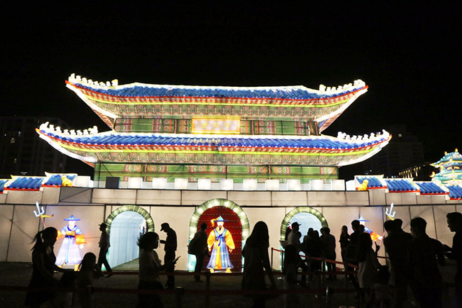 Những ngày qua, hàng ngàn người dân đổ về khu vực đường Tân Trào (khu đô thị Phú Mỹ Hưng, quận 7) để tham quan, chụp ảnh lễ hội ánh sáng lần đầu tiên được tổ chức tại TP.HCM. Trong ảnh là khu vực cổng soát vé vào lễ hội. Cổng được thiết kế như cung đình thời phong kiến Hàn Quốc, có lính canh và được thắp sáng khi TP lên đèn.