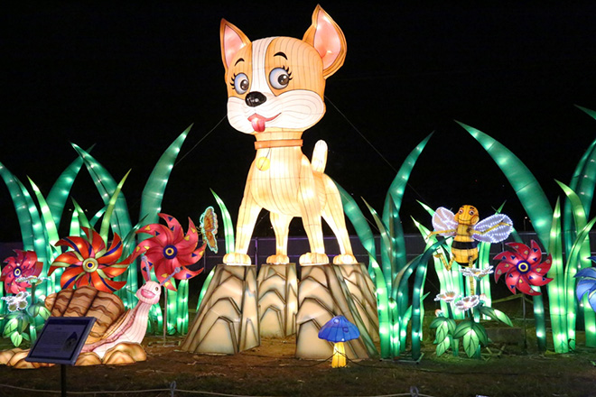 Khu vườn xanh với những mô hình côn trùng khổng lồ được thắp sáng.