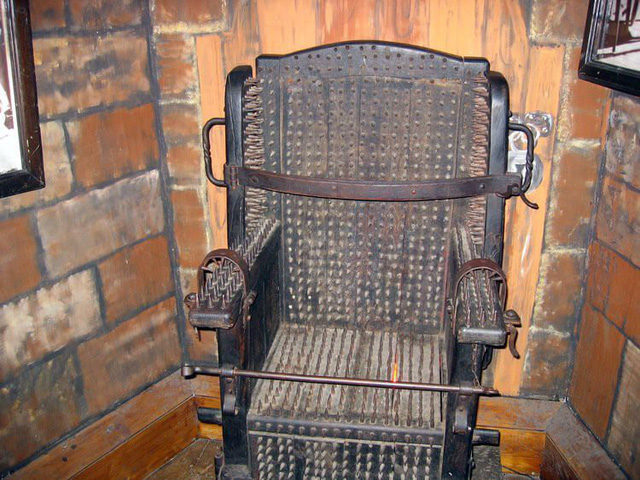 Có những chiếc ghế c̣n có cả chông nhọn bằng kim loại khắp ghế. Sau này trong nhà tù, chiếc ghế này trở thành ghế điện để hành quyết tội phạm.