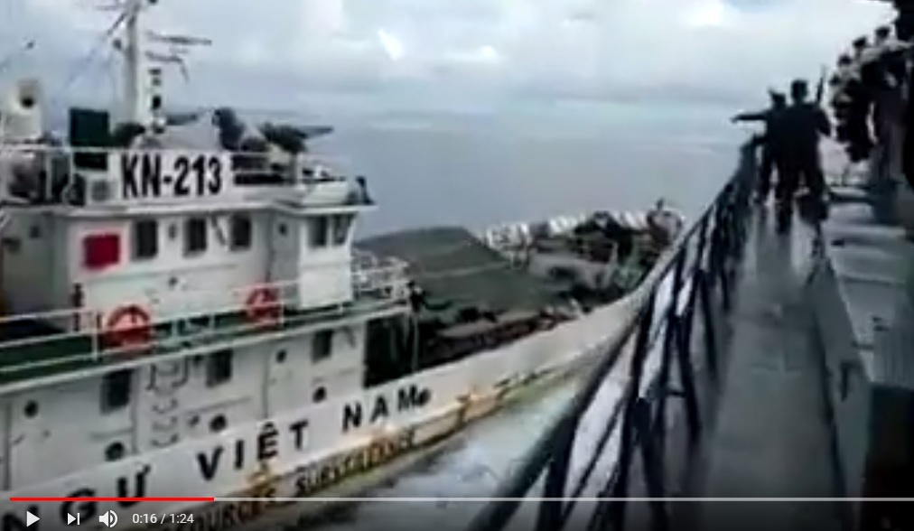 Video: Sắp đánh nhau to, tàu hải quân VN và Indonesia đâm nhau vào rạng sáng sớm 27-4-2019 theo giờ địa phương. Tàu Kiểm ngư Việt húc tàu Hải quân Indonesia giải cứu 2 ngư dân. Theo RFA, một đoạn video do phía Indonesia quay lại vừa được lan truyền trên mạng cho thấy tàu Kiểm ngư KN-213 của Việt Nam đâm vào tàu hải quân 381 của Indo giải cứu 2 ngư dân. Một tàu cá Việt Nam khi bị kéo đi đã bị phá nước được các tàu cá khác lai dắt, còn lại 12 ngư dân và tàu cá tỉnh Bình Định số hiệu BĐ 97916 TS bị bắt giữ đưa về vùng biển Indonesia.