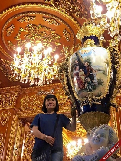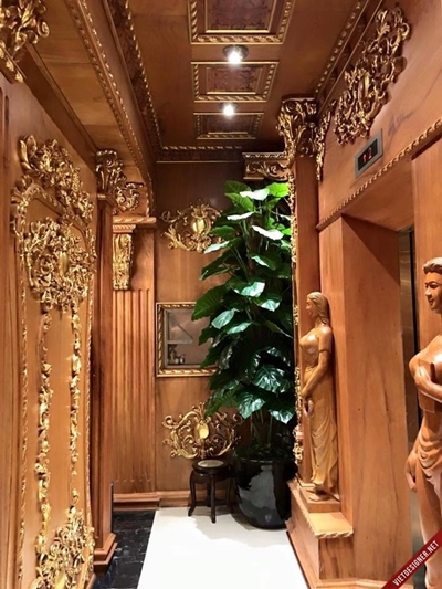 Căn biệt thự 5 tầng này sử dụng toàn bộ đồ nội thất bằng gỗ nguyên khối. Sau khi qua tay thợ mộc, chúng được chạm trổ và thành những bàn ghế, giường, tủ… Đi khắp tòa lâu đài này, có một điểm khiến người ta khá ngạc nhiên là ông Thanh không chuộng ánh sáng tự nhiên mà thích ánh sáng đèn. Thế nên, mọi ngóc ngách trong nhà đều được sử dụng những chùm đèn được mạ vàng bắt mắt.
