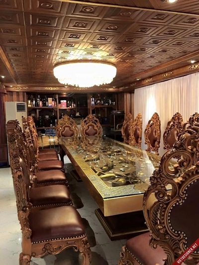 Có lẽ vì tham khảo ý kiến của những chuyên gia phong thủy nên vị đại gia này sử dụng khá nhiều vàng. Ngay bên trong bộ bàn ăn, ông cũng làm kiểu bàn rỗng và khắc hình ảnh cá chép vàng, thủy sinh, nước và đặt một tấm kính lên trên. Phía dưới bàn ăn là một chiếc tủ gỗ chuyên để những chai гượυ ngoại xa xỉ.