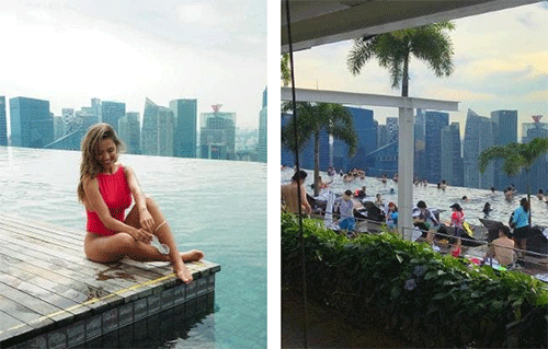 Ảnh trái là những gì bạn thường hình dung về bể bơi vô cực trên nóc con thuyền của khách sạn Marina Bay Sands - biểu tượng du lịch nổi tiếng ở Singapore. Còn ảnh phải sẽ đưa bạn về với thực tế.