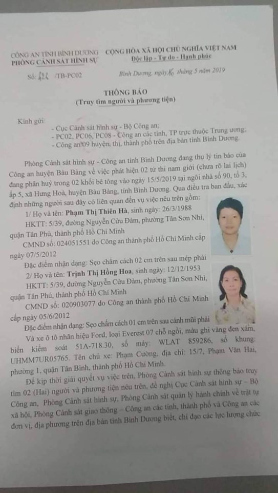 Hai thi thể bị sát hại được phát hiện tại căn nhà ở Bàu Bàng đều là nam giới. Trong độ tuổi 31-35 tuổi và bị giết hơn 1 tháng trước. Các đối tượng nằm trong diện tình nghi đều là phụ nữ.