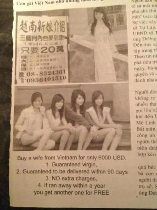 Trên internet của Nam Hàn, Tàu cộng rao bán cô dâu Việt Nam như bán trái dưa trái cà, con cá con gà. Trái dưa hư thì đổi cho trái khác, con gà mà xổng chạy mất thì đền cho con khác. Gà còn trinh.