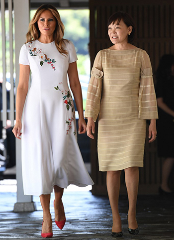 Đệ nhất phu nhân Melania diện váy trắng thêu hoa đi cạnh người đồng cấp Nhật Bản Akie hôm 27/5. Ảnh: AFP