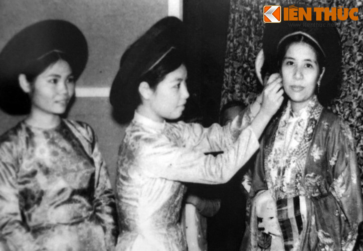 Phù dâu chuẩn bị trang phục cho cô dâu trong đám cưới của cố họa sĩ Vinh Phối và bà Thạch Huệ, 9/3/1969, nay ở phường Phú Cát, TP Huế.