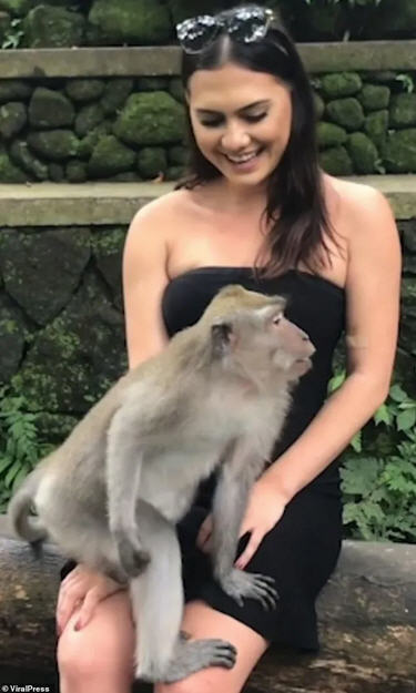 Nữ du khách xinh đẹp bị chú khỉ kéo váy làm lộ ngực
