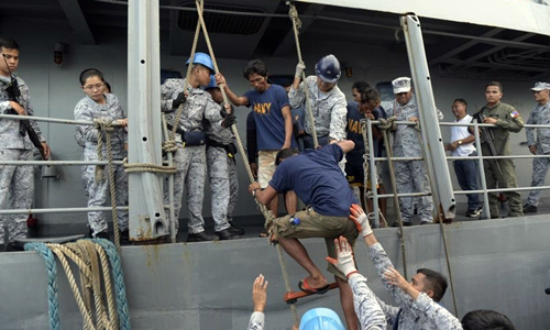 Ngư dân Philippines lên tàu hải quân để về bờ hôm 14/6 sau khi được tàu Việt Nam giải cứu. Ảnh: AP.