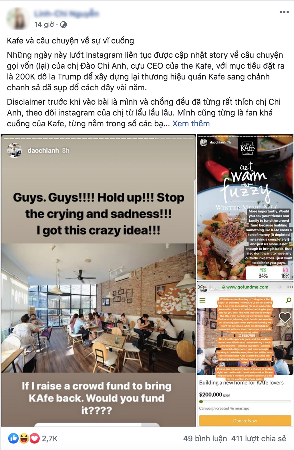 Chia sẻ của bạn L.C về thông tin kêu gọi vốn nhằm mở lại The KAfe của cựu CEO Đào Chi Anh (Ảnh chụp màn hình).