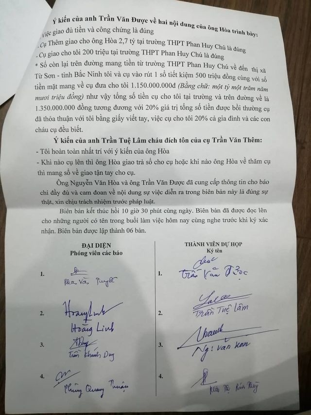 Biên bản được lập ngày 13/7/2019 tại Trường THPT Phan Huy Chú (huyện Thạch Thất) ghi nhận sự việc ông Nguyễn Văn Hoà cầm của ông Thêm 2,7 tỷ đồng, anh Trần Văn Được lấy 1,35 tỷ đồng. Nguồn: Dân Trí