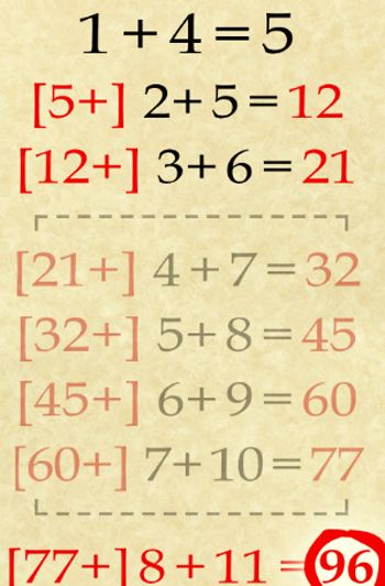 Cách giải: Mỗi số đầu tiên và số thứ hai của các phép tính đều tạo thành một chuỗi số theo thứ tự lần lượt là: "1, 2, 3" và "4, 5, 6". Phép tính cuối cùng tuy phá vỡ quy tắc này, nhưng trên thực tế nó lại hoàn toàn phù hợp, nếu như thêm bốn phép tính nữa vào giữa phép tính thứ ba và phép tính cuối. (Xem minh họa).