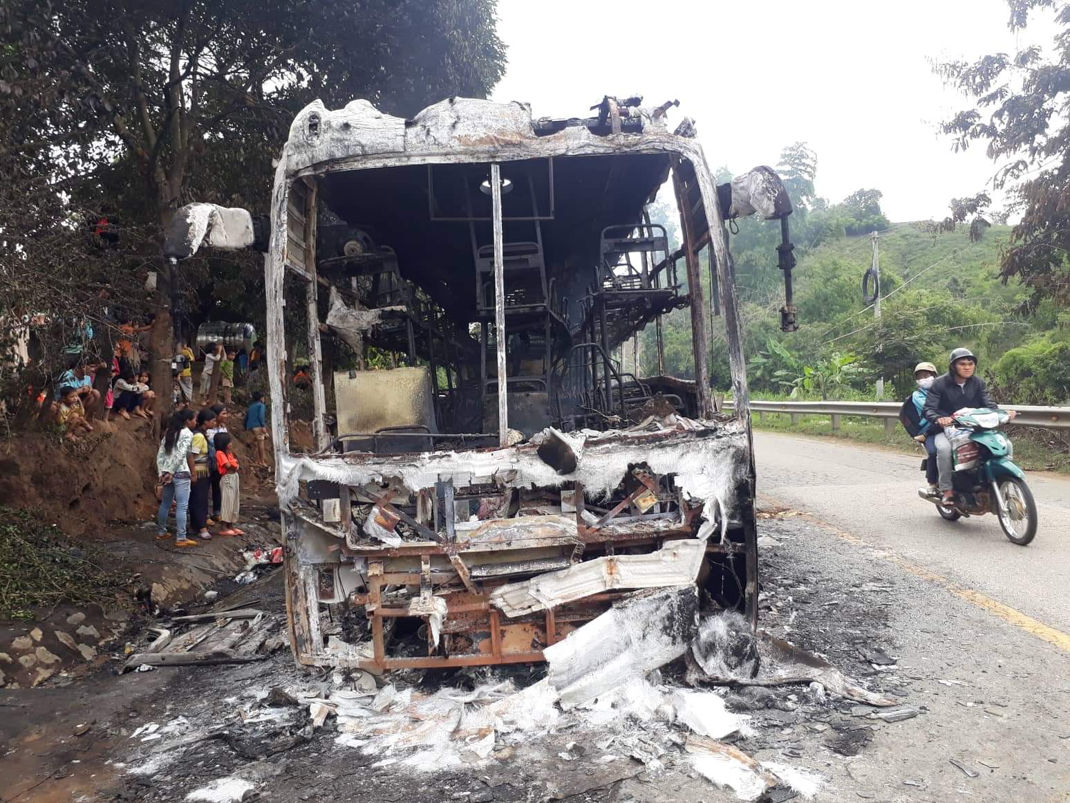 Sáng 21/7, Công an huyện Đắk Glei cho biết, trên địa bàn vừa xảy ra vụ cháy xe khách 45 chỗ, rất may vụ cháy không gây thương vong về người, chiếc xe khách cháy trơ khung.