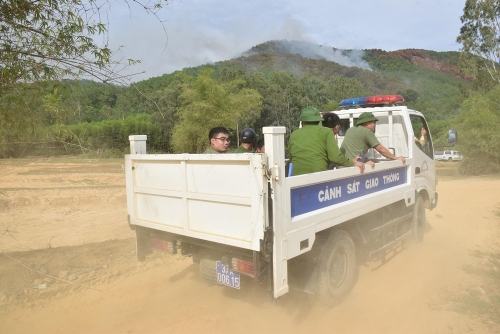 Do lửa cháy lây lan rộng nên huyện Yên Thành huy động thêm lực lượng công an đến hiện trường để ứng cứu dập lửa rừng. Nguyên nhân vụ cháy đang được lực lượng chức năng tiến hành điều tra, làm rõ. Ảnh: Xuân Hoàng