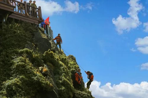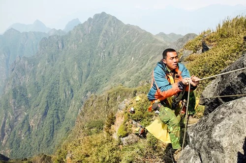 Sau khi kiểm tra lần cuối, Nhỉ dòng thừng qua khoen đai lưng rồi từ từ nhả dây, thả dần người xuống vách đá dựng đứng. Ở phía trên, hai đồng nghiệp của anh cũng bồn chồn, liên tục nhắc: "Cẩn thận, bên trái có cây đỗ quyên lớn. Sang phải một chút. Chậm thôi". Chưa đầy một phút, Nhỉ đã lẫn mờ trong sương.
