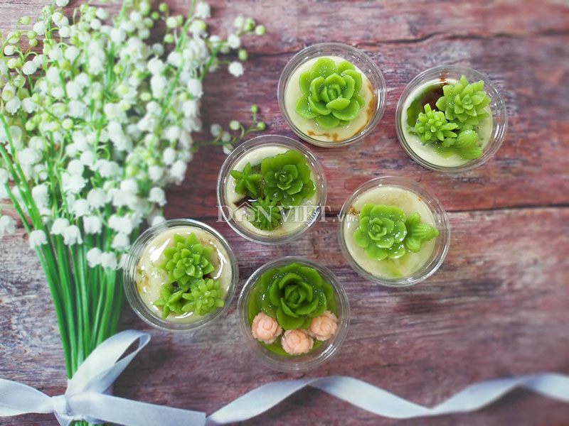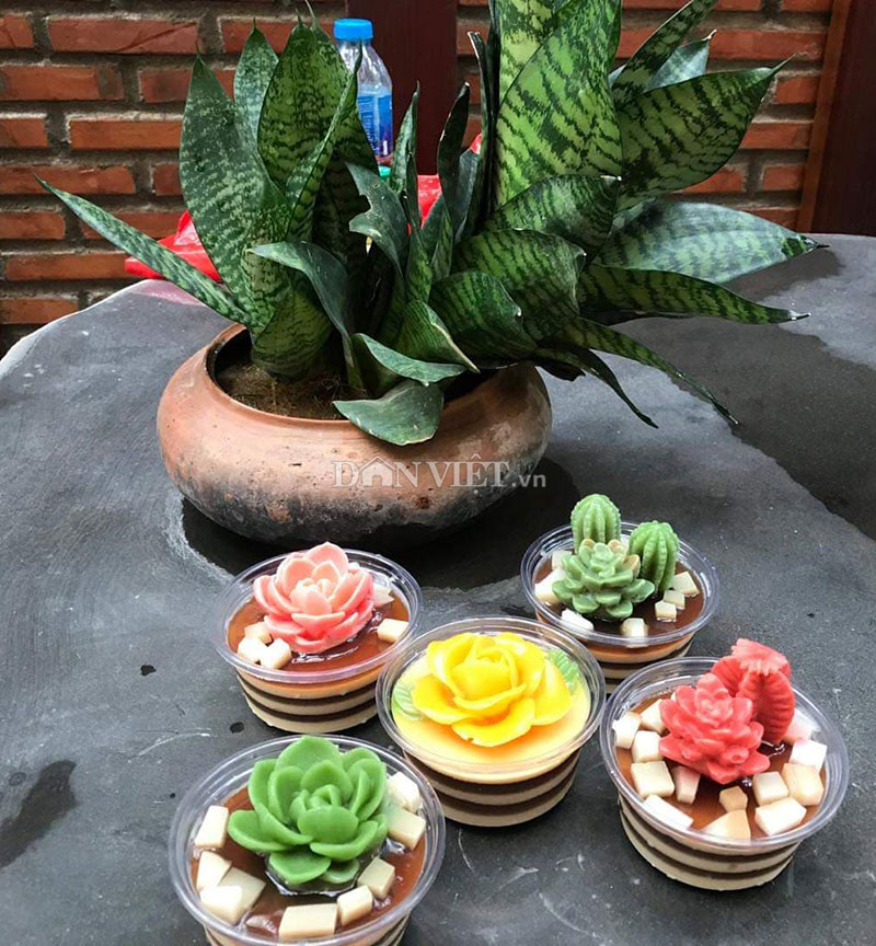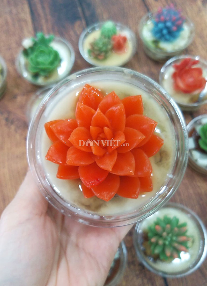 Theo tìm hiểu của phóng viên DANVIET.VN, mỗi "chậu" sen đá của chị Ngân gồm: phần dưới là rau câu flan cheese hoặc rau câu sơn thủy hoặc thảo mộc .... và phần rau câu vị matcha tạo hình sen đá. Chị Ngân đã dùng khuôn để "đúc" những cây, hoa thạch. Kinh nghiệm của chị là nấu rau câu hơi đặc hơn bình thường và để thật nguội mới gỡ khuôn, như vậy hoa không bị rụng cánh. Sau đó, để cố định cây sen đá lên phần đế, chị dùng nước rau câu nóng rưới vào.
