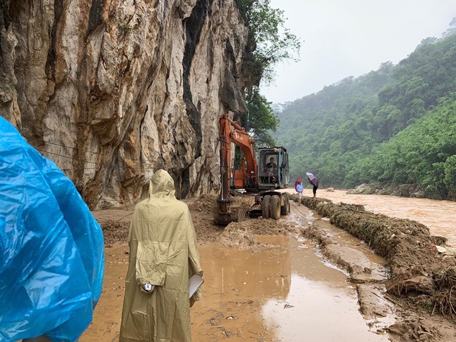 Lực lượng chức năng khắc phục tuyến đường giao thông từ thị trấn Quan Sơn đi lên xã biên giới Na Mèo