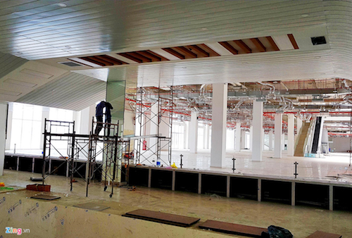 Bên trong nhà ga, công nhân đang lắp đặt quầy bán vé, quầy thông tin... Ngoài chức năng chính là cung cấp dịch vụ vận tải, bến xe kết hợp với các tiện ích khác như bãi đậu xe cao tầng, khu vực sửa chữa, trạm tiếp nhiên liệu, khu trung chuyển và giao dịch hàng hóa, khu thương mại dịch vụ, giải trí...