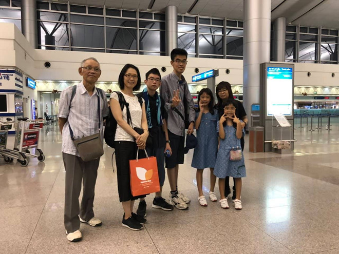 Cụ Oki (ngoài cùng, bên trái) chụp ảnh kỷ niệm cùng gia đình tại sân bay Tân Sơn Nhất (TP.HCM) trước khi lên máy bay về Tokyo sáng 4.8