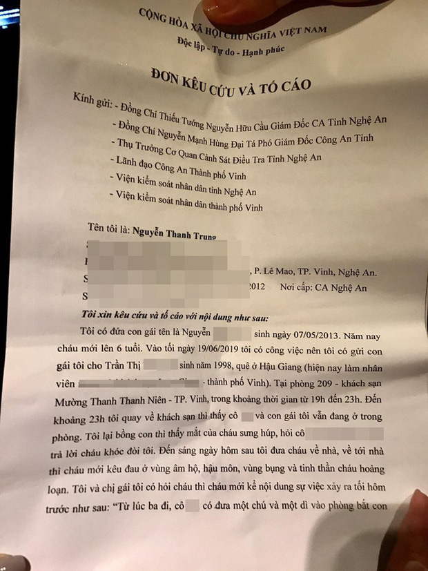 Ngày 7/8, một lãnh đạo Công an tỉnh Nghệ An cho biết, phía công an tỉnh đã nắm được thông tin vụ việc anh Nguyễn Thanh Trung (23 tuổi, trú phường Lê Mao, TP. Vinh) tố cáo con gái anh 6 tuổi bị một nhóm người xâm hại tình dục trong một khách sạn trên địa bàn TP. Vinh.