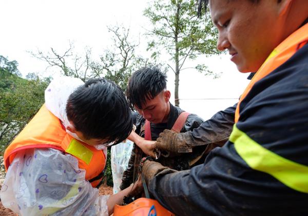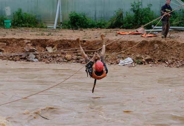 Để giải cứu, họ được lắp bộ đai bảo hộ, đu trên dây để cảnh sát kéo qua suối bằng tay. "Mưa liên tục nhiều ngày, rạng sáng 8/8 thì nước đổ về gây sập cầu, chúng tôi bị mắc kẹt, bốn bề xung quanh là nước", một người được cứu nói.