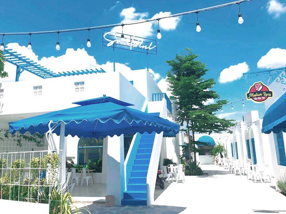 Là một trong những quán cà phê đẹp ở Biên Hòa được dân tình săn đón nhiều nhất trong thời gian gần đây, Santorini Coffee là tiệm cà phê mới toanh. Đúng như tên gọi Santorini, quán được thiết kế với tone màu chủ đạo là trắng và xanh giống hệt như hòn đảo Santorini xinh đẹp. Phía bên ngoài quán, tường được sơn trắng, khung cửa, cánh cửa được sơn màu xanh. Đặc biệt, ngay cả bàn ghế cũng được trang trí cùng tone màu trắng, xanh.