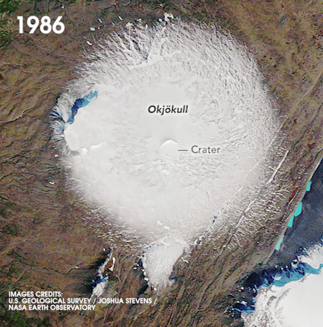 Mới đây trên trang Twitter của NASA đã đăng tải tấm hình chụp từ vệ tinh Landsat của Hoa Kỳ, cho thấy sự thay đổi kinh khủng của Okjökull trong 3 thập niên gần nhất (từ 1986 - 2019). Đoạn tweet đưa ra cho biết rằng Okjökull chính là dòng sông băng đầu tiên tại Iceland mất đi danh hiệu của mình.