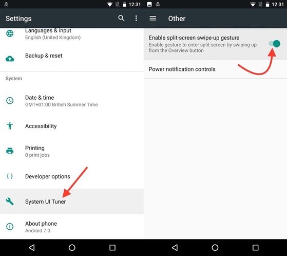 Nếu đang sử dụng Android 7 (Nougat), bạn có thể kích hoạt chế độ Spilt Screen bằng cách vào mục Settings (cài đặt) > System UI Tuner > Other > Enable split-screen swipe-up gesture để chia đôi màn hình. Điều này đặc biệt hữu ích trong trường hợp người dùng muốn mở hai ứng dụng cùng lúc, chẳng hạn như vừa soạn tin nhắn vừa tìm địa điểm trên Google Maps...
