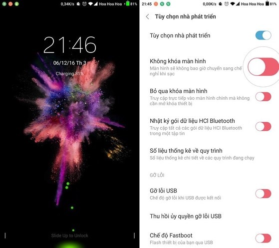 Để giữ cho màn hình luôn sáng khi đang cắm sạc, bạn hãy kích hoạt tùy chọn Stay awake (không khóa màn hình) trong phần cài đặt dành cho nhà phát triển.