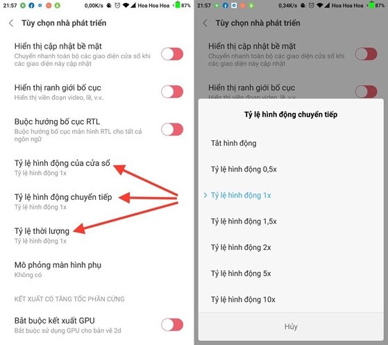 Mặc định, tốc độ hiển thị ảnh động sẽ là 1x, nếu muốn thay đổi, người dùng chỉ cần truy cập vào tùy chọn dành cho nhà phát triển, tìm đến ba mục Windows animation scale (tỉ lệ hình động của cửa sổ), Transition animation scale (tỉ lệ hình động chuyển tiếp) và Animator duration scale (tỉ lệ thời lượng), sau đó điều chỉnh về mức .5x (nhanh), 2x, 5x, 10x (chậm) hoặc tắt hoàn toàn hiệu ứng (Animation off).