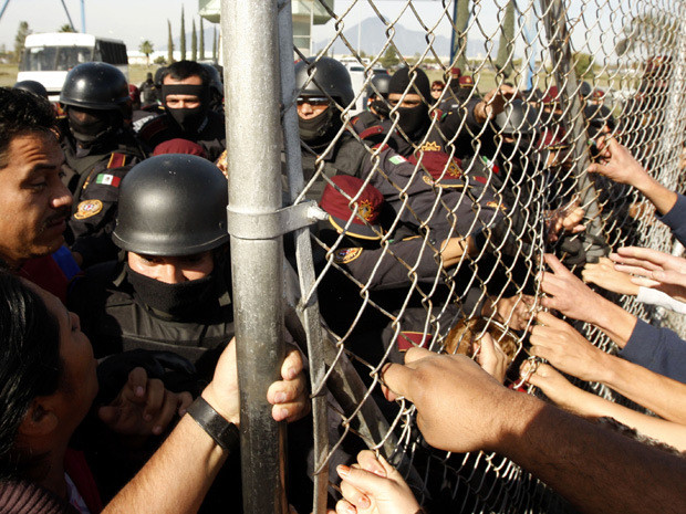 Cảnh sát ngăn cản cuộc biểu tình của gia đình tù nhân thiệt mạng trong cuộc ẩu đả giữa hai băng nhóm ở nhà tù tại Mexico năm 2012. Ảnh: AFP.