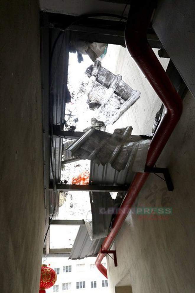 Phần mái tôn bị thủng sau khi 3 mẹ con rơi xuống.