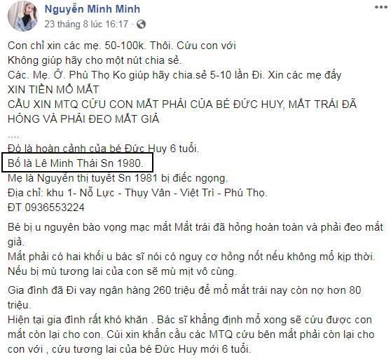 Thế nhưng hôm 23.8 vừa qua, tài khoản Facebook Nguyễn Minh Minh lại đăng status xin cộng đồng mạng gửi tiền giúp bé Nguyễn Đức Huy nhưng thay số điện thoại và tài khoản của người nhận từ anh Nguyễn Văn Tư thành Lê Minh Thái. Trong status, Nguyễn Minh Minh viết Lê Minh Thái là bố bé Nguyễn Đức Huy! Kèm theo status là ảnh và clip đáng thương của cậu bé.