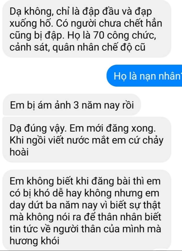 – Họ đập đầu xô xuống hố, nghe nói chưa chết vẫn bị chôn, người làm chuyện đó sau này bị điên, họ khai ra mình mới biết.