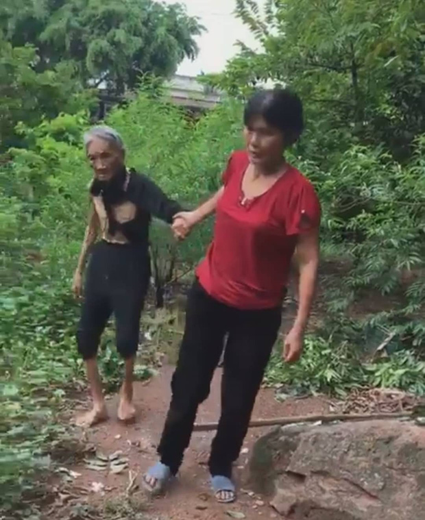 Hình ảnh bà Châu được con dâu dắt từ vườn (phía chuồng bò) đi vào nhà, trên người mặc chiếc áo rách nát (Ảnh cắt từ clip do ông Yên quay lại).