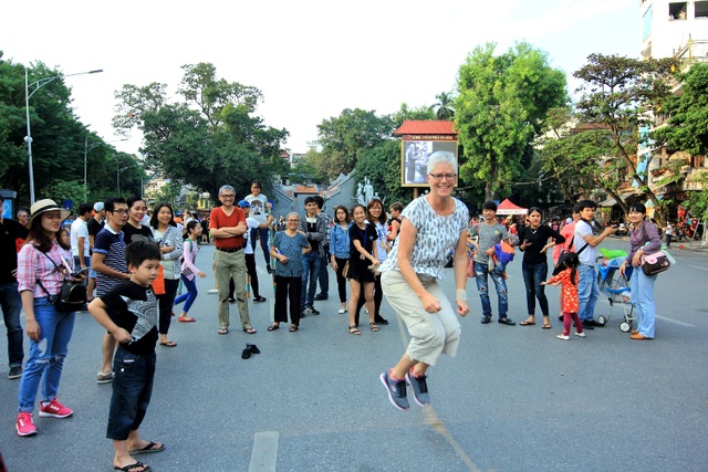 Khách du lịch thích thú với một trò chơi trên phố đi bộ ở Hà Nội.