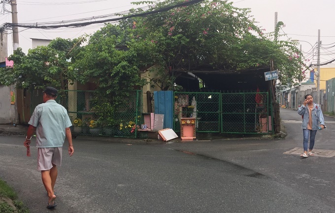 Phía trước nhà ông Nguyễn Văn Hai. Sau cửa lưới B40 là gian thờ các pho tượng. Bên trái trong rào là ngôi miếu đã được ông xây lại kiên cố.