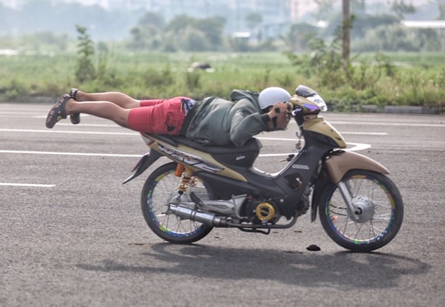 Các quái xế biểu diễn đủ trò nguy hiểm như nằm trên xe để được bay như chim, gác chân lên tay lái, dang chân ra hai bên khi chạy, chẳng khác nào đang bán mạng cho "thần tốc độ".