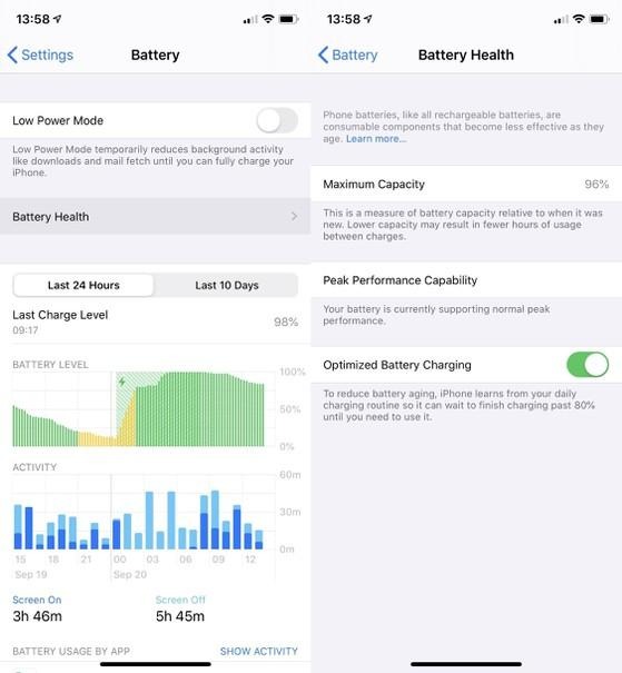 Tính năng Optimized Battery Charging (tối ưu hóa việc sạc pin) được kích hoạt mặc định trên iOS 13, giúp ngắt bộ sạc khi pin đạt mức 80%. Nếu không thích, người dùng có thể vô hiệu hóa tùy chọn này bằng cách vào Settings (cài đặt) - Battery (pin) - Battery Health (sức khỏe pin) - Optimized Battery Charging (tối ưu hóa việc sạc pin).